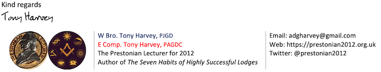 I had been a council member and trustee of the Royal Masonic Trust for Girls & Boys (RMTGB) since 2013. So, from the beginning of 2015 the 2012 Prestonian Lecture raised money for RMTGB and donated £6,437.52 to its final Festivals.